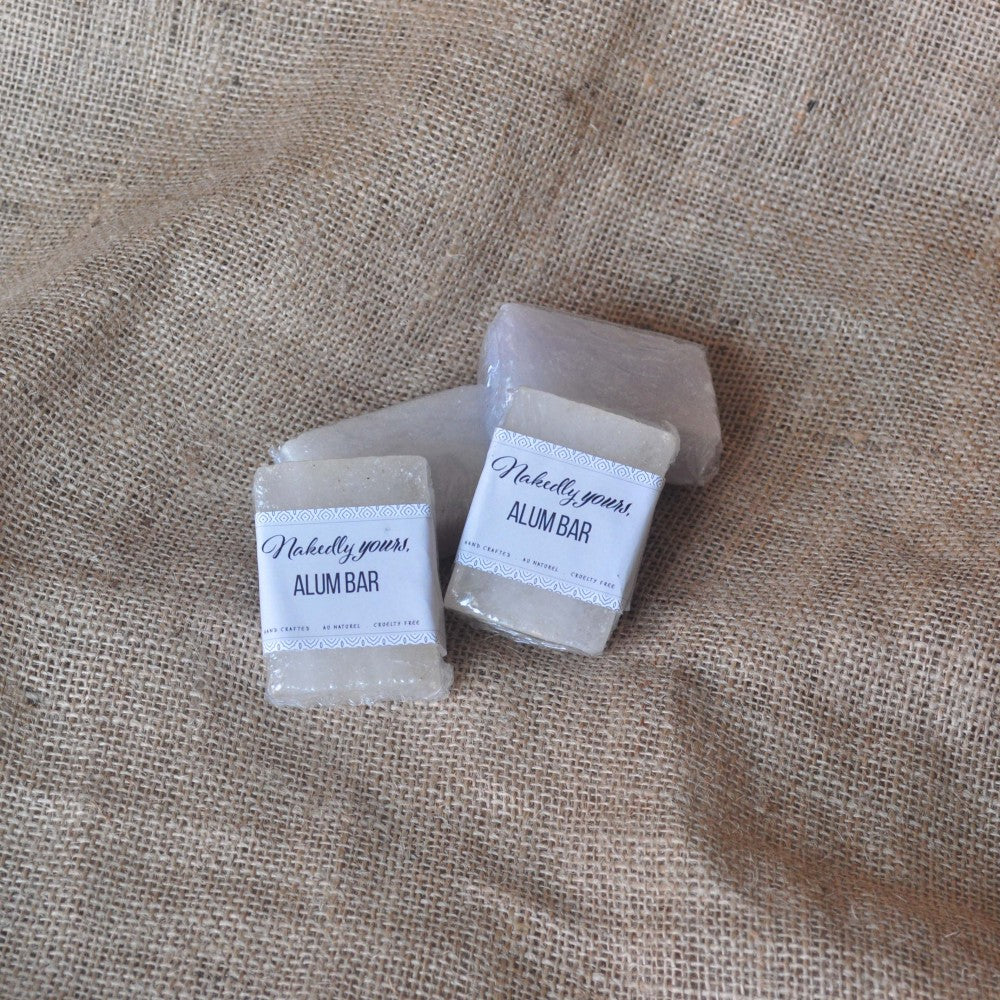 ALUM BAR is a natural odourless crystal with antibacterial and styptic properties. It helps seal the nips and cuts after shaving and refreshes and cools the skin. It works like a charm as a natural deodorant by eliminating odour causing bacteria without blocking your skin pores like an anti perspirant.
